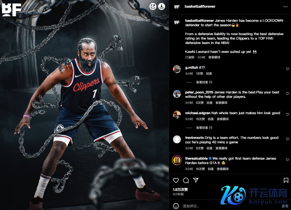 好意思媒basketballforever晒出哈登缠着铁链的殊效图并配文写说念:“哈登已成为又名LOCKDOWN(闭塞型)驻扎者🔒🔥从驻扎薄弱到现时领有全队最好驻扎评级,携带快船队成为NBA驻扎名次前五的球队!莱昂纳德以致还莫得出场。”