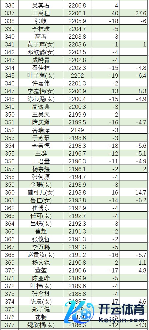 张浩伟 2178.0 韩 刚 2177.0 高又彤* 2174.5